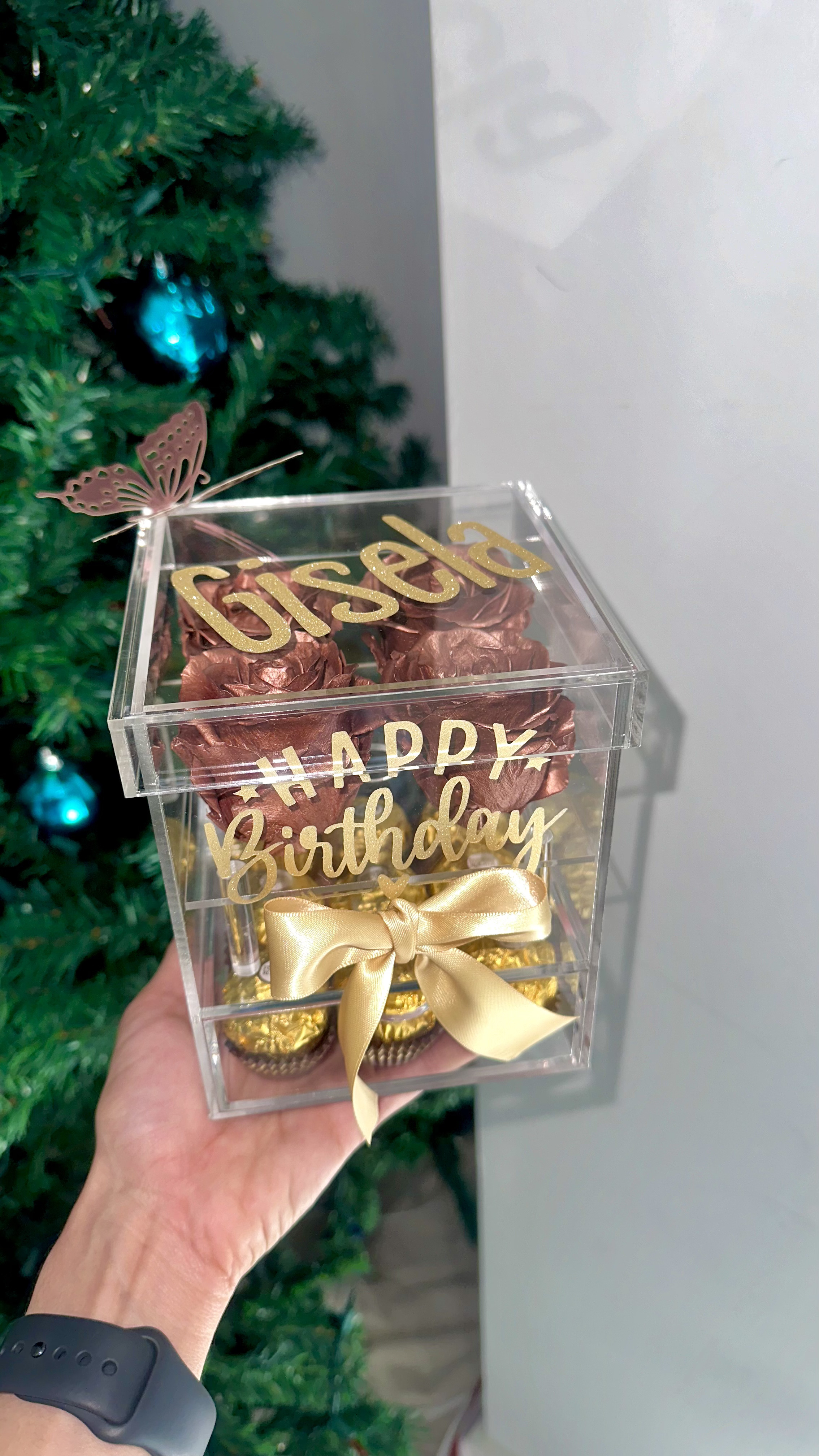 Preserved natural roses, last approximately 3 years or more! Acrylic box with strawberries and/or Ferrero Rocher chocolates, personalize it with your preferred rose color.