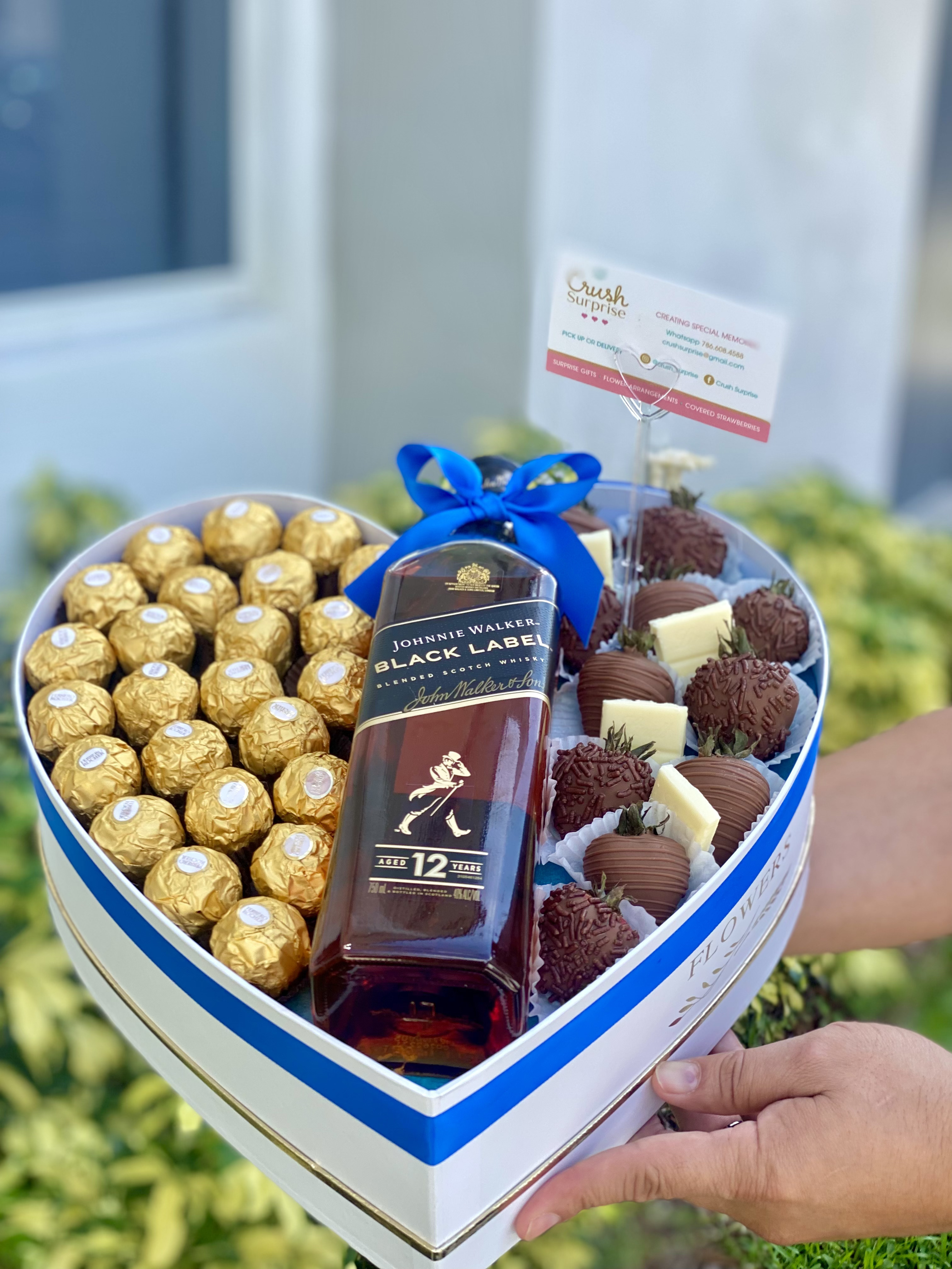 Heart box with Black Label 750ml, strawberries, chocolates and personalized balloon.